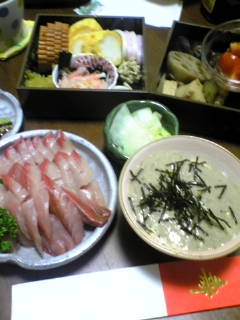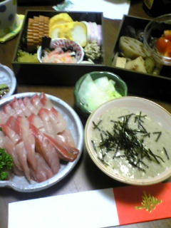三日とろろ、寒ブリ刺身、おせちの残り。
